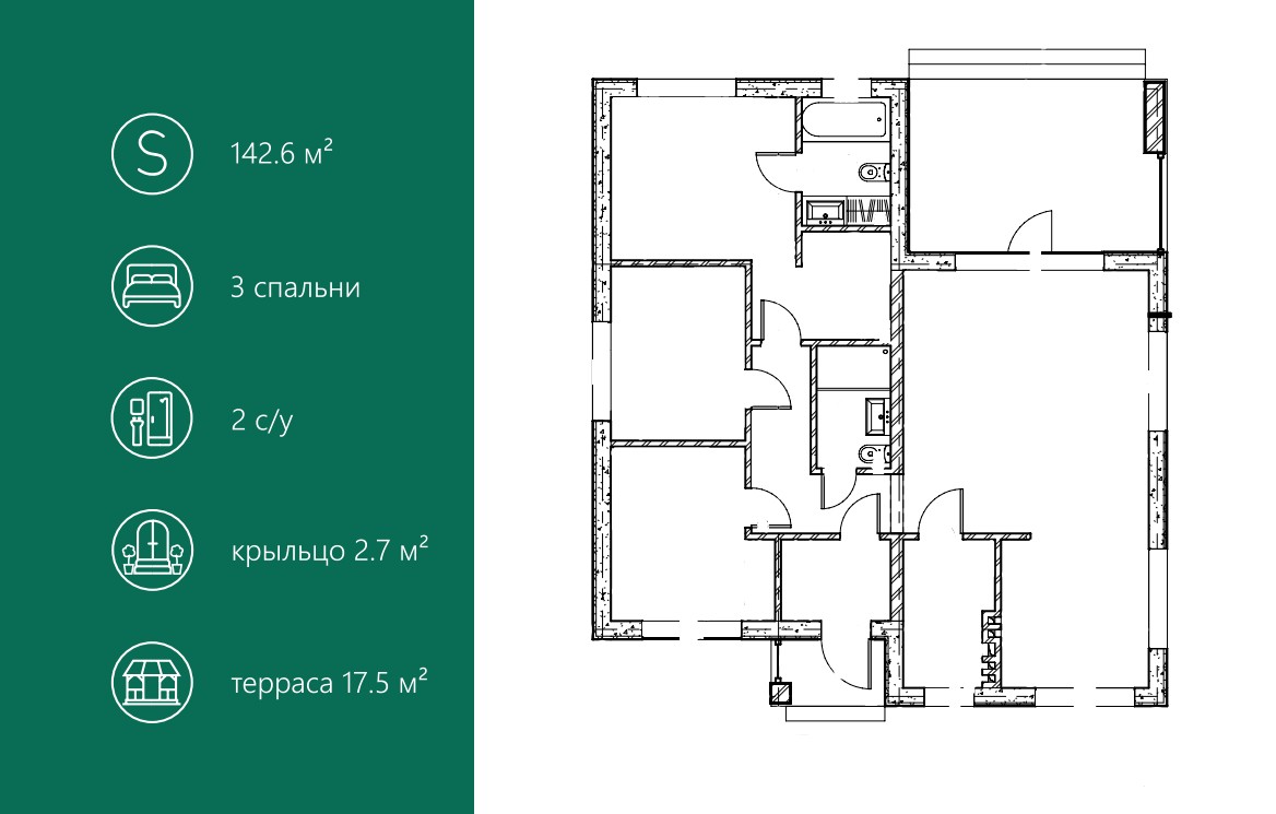 Площадь: 140 м² — 3 комнаты + кухня гостиная